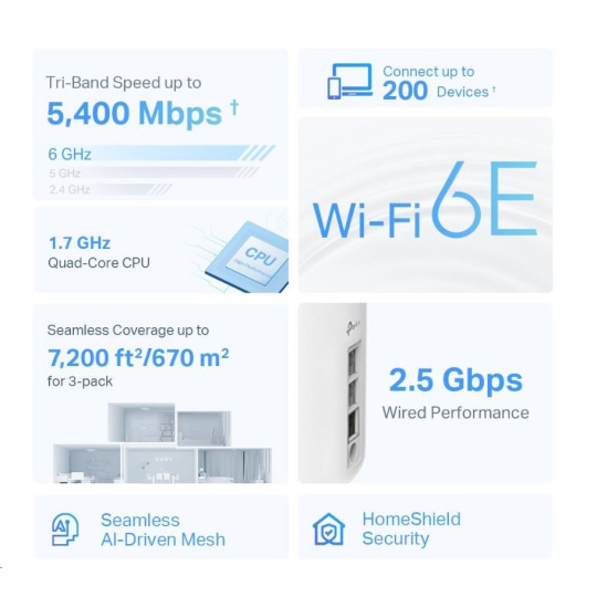 • Úplne nové pásmo 6 GHz – začnite využívať najnovšiu frekvenciu Wi-Fi a zbavte sa rušení, ktorých pôvodcom sú všetky staršie zariadenia. Pásmo 6 GHz tiež poskytuje výkonné vyhradené páterné pripojenie na ďalšie zlepšenie výkonu Wi-Fi pripojenia u zariadení bez podpory štandardu Wi-Fi 6E
