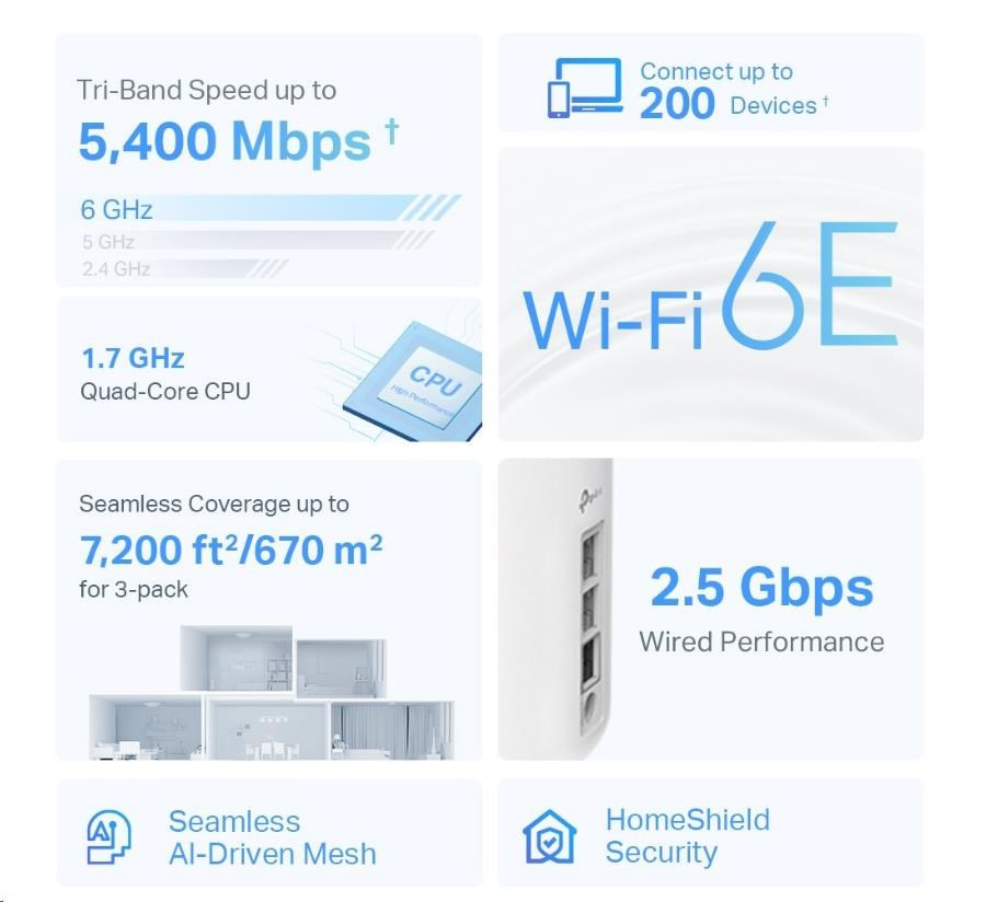 • Wi-Fi 6E pokrytie celej domácnosti – pokryte plochu až 500 m2 ničím nerušeným Wi-Fi signálom budúcej generácie a zabudnite na mŕtve zóny pokrytia a načítanie do vyrovnávacej pamäte