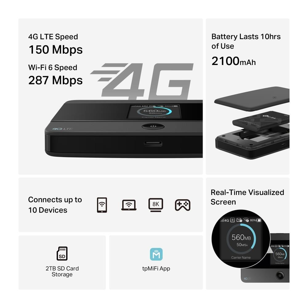 | Screen Display | Traffic statistics, Wi-Fi status, User numbers, Network type (4G/3G), Signal strength, Internet connection status, Messages, Battery meter, Wi-Fi password |