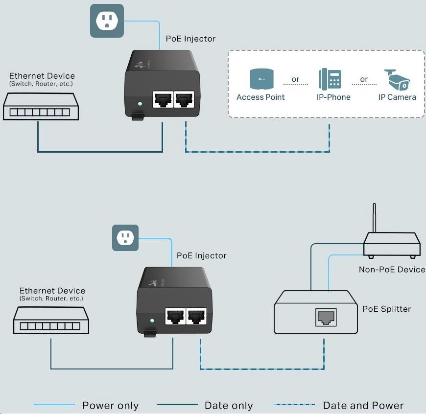 Injektor PoE+ POE160S plně vyhovuje standardu IEEE 802.3af/at a podporuje všechny adaptéry přijímače PD nebo PoE kompatibilní se standardem IEEE 802.3af/at PoE, např. TP-Link POE10R nebo jiné podobné produkty a rozšiřuje vaši síť tam, kde není elektrické vedení či zásuvka pro připojení zařízení, jako jsou přístupové body, IP kamery, IP telefony apod.