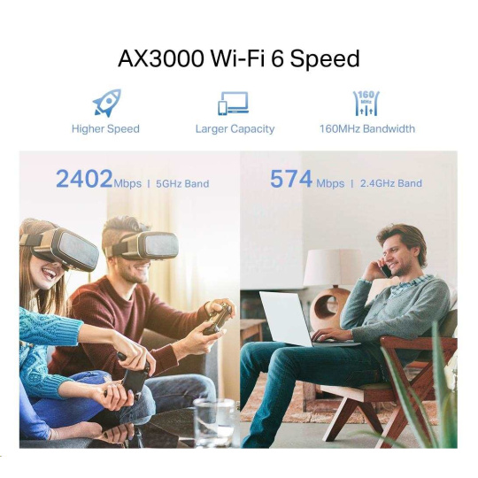 - Dvoupásmová sieť Wi-Fi 6 - oddelené pásma 5 GHz (2 402 Mbit/s) a 2,4 GHz (574 Mbit/s) siete Wi-Fi prinášajú vďaka najnovším technológiám vyššiu rýchlosť a väčšiu priepustnosť.