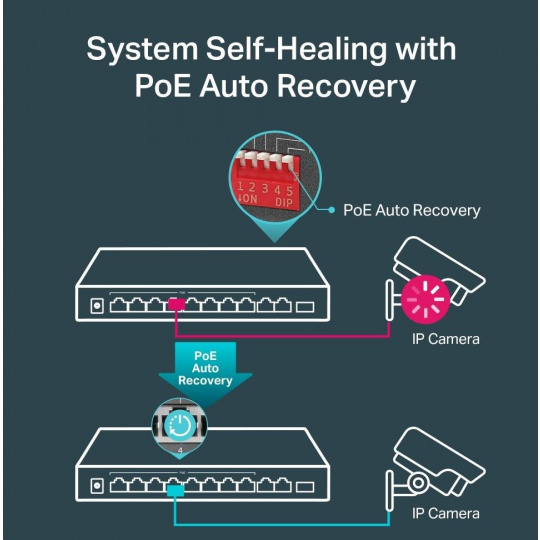 - S funkciou automatického obnovenia PoE automaticky reštartuje vypnuté alebo nereagujúce zariadenia napájané cez PoE.
