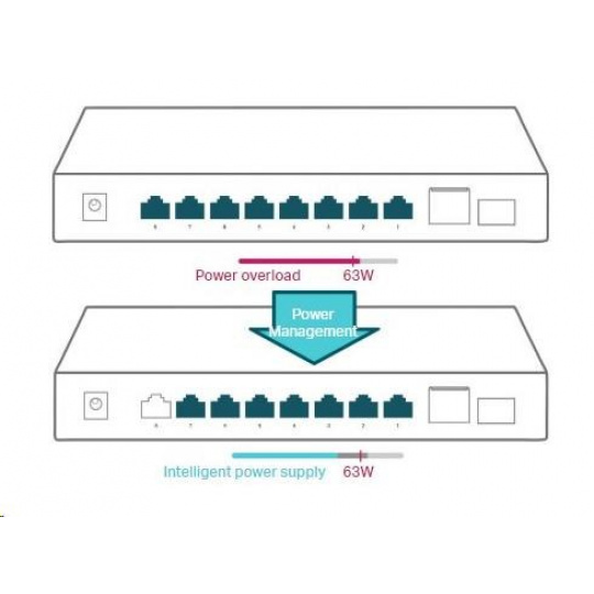- Vysoký PoE rozpočet napájania s až 30W na každý PoE port a 63W na všetky PoE porty