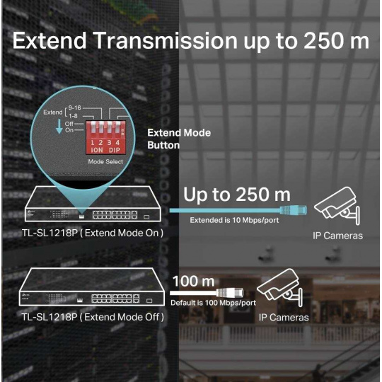 • Extend Mode (až do 250m PoE napájania a prenosu dát)