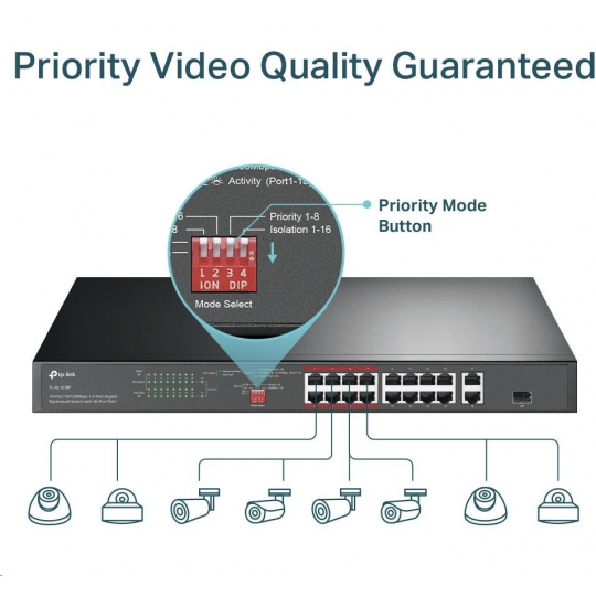 • Prioritný režim pre porty 1-8, ktorý zaručuje kvalitu citlivých aplikácií, ako je napríklad video monitorovanie.