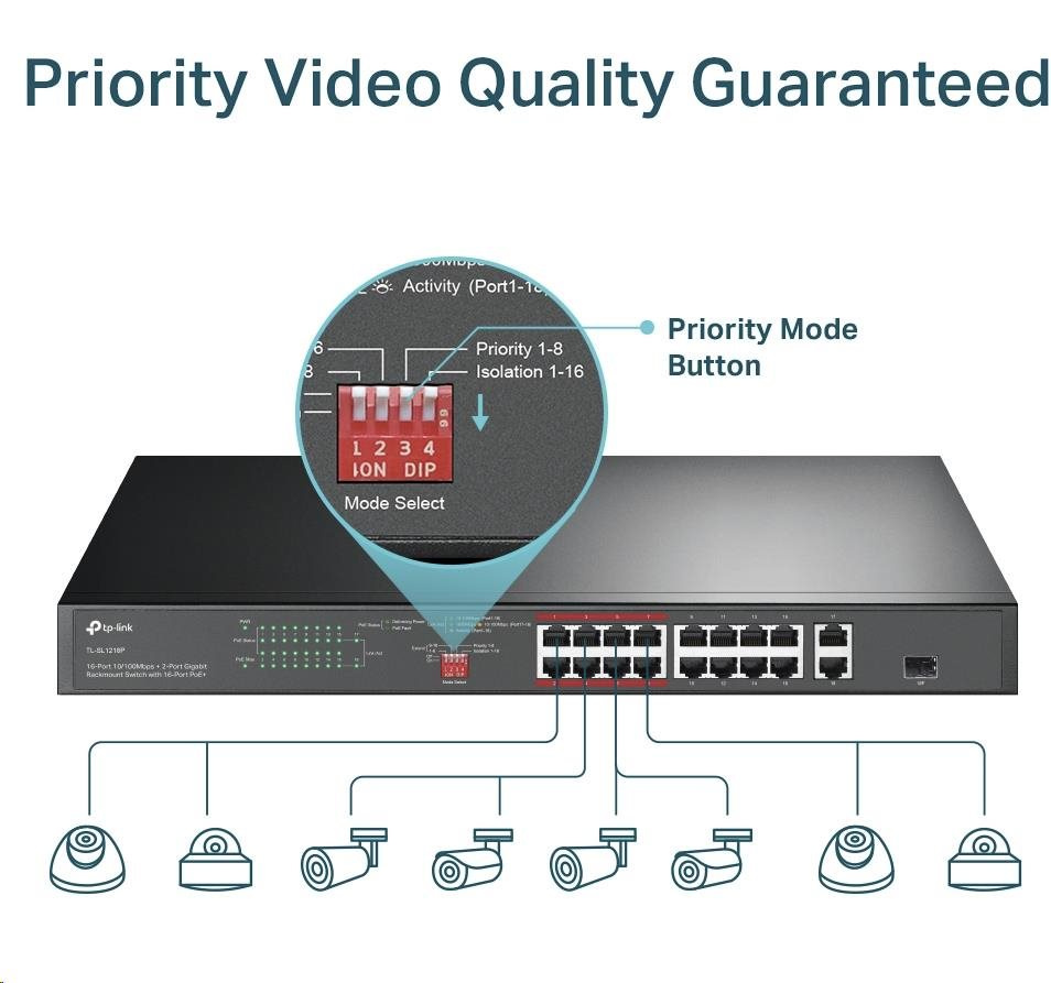 - Prioritný režim pre porty 1-8, ktorý zaručuje kvalitu citlivých aplikácií, ako je napríklad video monitorovanie.