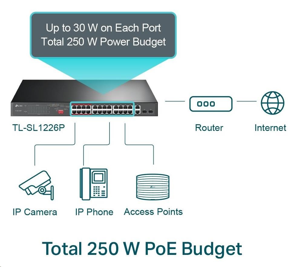 Vyhovuje štandardu 802.3af/at PoE + a podporuje až 30 W napájania na každom PoE porte. Celkový výkon napájania až 250 W PoE pre 24× PoE portov, umožňuje široké spektrum aplikácií, ako je dohľad, kancelárie, koleje a malé podniky. Je plne kompatibilný s IP kamerami, prístupovými bodmi, IP telefónmi, počítačmi, tlačiarňami atď.