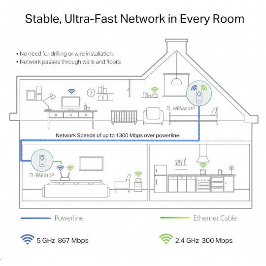 - Dvoupásmová sieť Wi-Fi AC1200 – zariadenie rozšíri ultra rýchlu dvoupásmovú Wi-Fi sieť s rýchlosťou až 867 Mbit/s v pásme 5 GHz a až 300 Mbit/s v pásme 2,4 GHz.