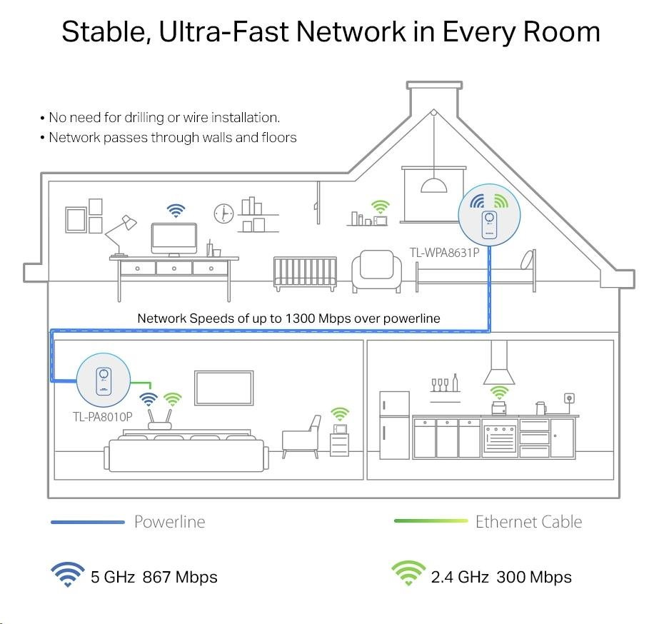 TP-Link TL-WPA8631PKIT OneMesh/EasyMesh WiFi5 průchozí powerline set (AC1200,AV1300,2,4GHz/5GHz,3xGbELAN)