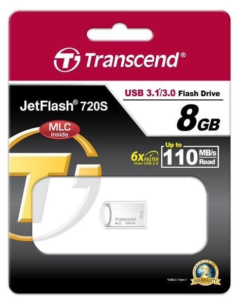 TRANSCEND Flash disk 8GB JetFlash®720S, USB 3.1, riešenie MLC (R:110/W:25 MB/s) striebro