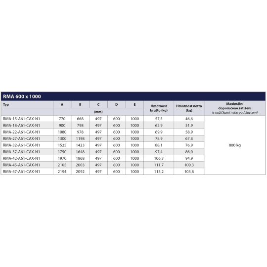 | Maximálne zaťaženie: | 800 kg |