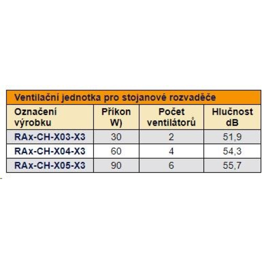 Vetracia jednotka pre rackové skrine – inštaluje sa do uzáveru z vonkajšej strany skrinky, do základne z vnútornej strany skrinky. Pri inštalácii do spodnej časti skrinky je potrebné použiť montážny rám spodnej vetracej jednotky – RAx-CH-Xxx-X1, ktorý sa inštaluje pomocou obojstrannej lepiacej pásky.