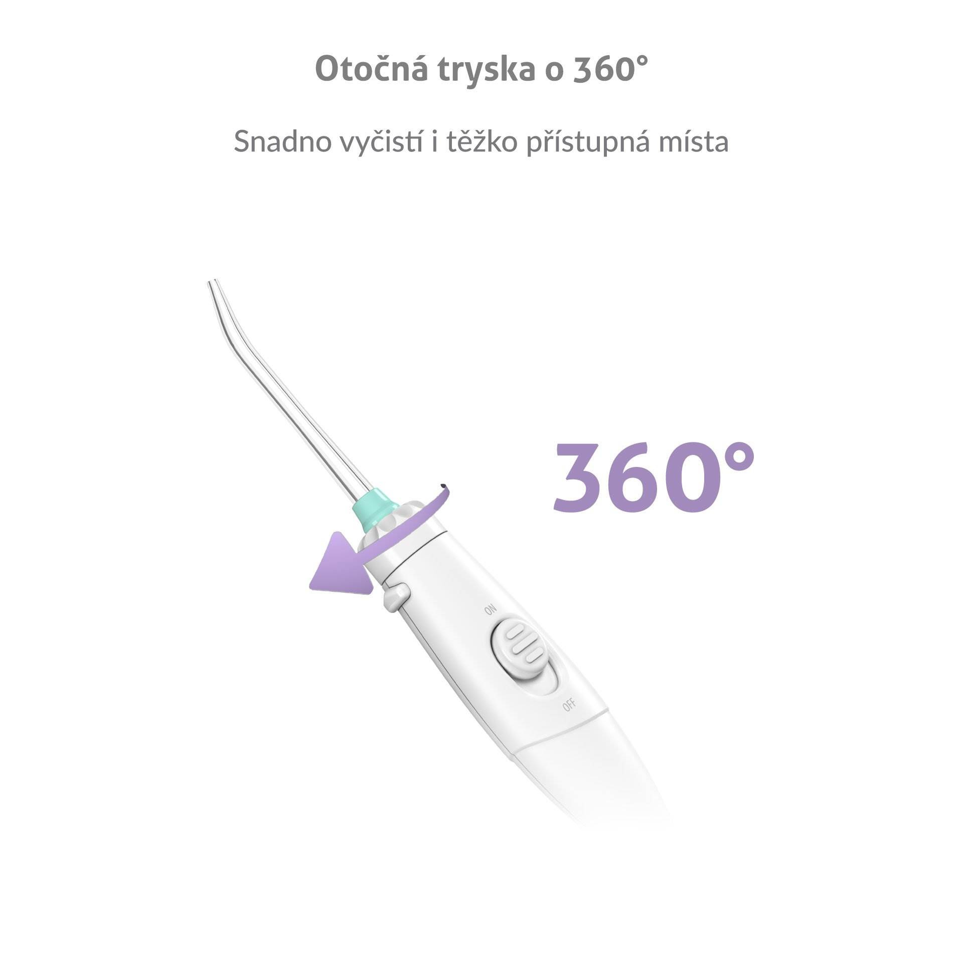 Hlavica trysky je otočná o 360 stupňov, takže jednoducho vyčistí všetky zákutia vašich úst.