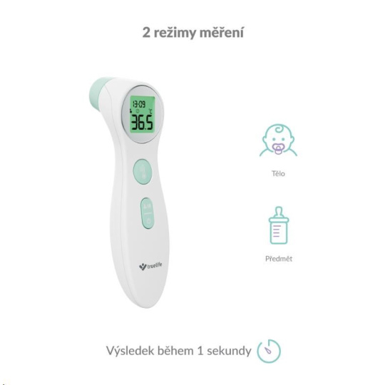 TrueLife Care disponuje dvomi režimami merania teploty. Okrem klasického merania telesnej teploty dokáže zmerať aj predmety, povrchy alebo tekutiny. Tak môžete ľahko skontrolovať napríklad kojeneckú stravu alebo čaj.