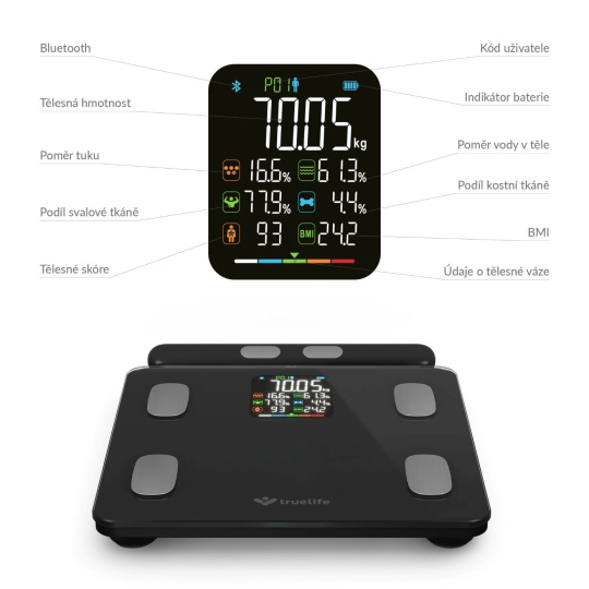 Zistite o svojom tele viac než len pouhú hmotnosť. Každý sme originál a jedinečnú skladbu má aj naše telo, preto o ňom chytrá váha TrueLife FitScale W8 BT Čierna prezradí detaily. Technológia TrueLife PrecisionIQ+® využíva 8 vysoko citlivých senzorov a s pomocou bioelektrickej impedančnej analýzy zmeria celkovú telesnú skladbu. Na prehľadnom farebnom LCD displeji zobrazí celkom 7 údajov - okrem hmotnosti aj percento tuku, svalov či vody. Prepojením cez Bluetooth s aplikáciou získate prehľadný report zahŕňajúci 15 telesných indexov vrátane ich popisu. Váha je schopná sledovať až 16 používateľov, u ktorých v aplikácii zaznamená 15 posledných meraní. Každého používateľa automaticky rozpozná, takže nie je potrebné nič prepínať. Ktokoľvek má však možnosť použiť váhu aj bez aplikácie. Prémiové tvrdené krycie sklo je elegantné a veľmi odolné s nosnosťou až 180 kg. Pri vážení si môžete zvoliť jednotky, a to buď kilogramy alebo libry. Vážacia odchýlka činí len 0,1 kg, takže vaše výsledky budú naozaj presné.