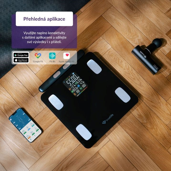 TrueLife FitScale W8 BT Čierna pomocou Bluetooth ľahko prepojíte s aplikáciou, ktorá je kompletne v češtine, prináša rad výhod a rozširuje možnosti osobnej váhy. Počas váženia sa údaje automaticky synchronizujú s aplikáciou, a to až pre 16 používateľov. Prehľadný report následne ponúka 15 indexov tela s detailným vysvetlením a odporúčaniami týkajúcimi sa stravy a cvičenia, ako postupovať k vytýčenému cieľu. Z 15 posledných meraní vytvorí aplikácia aj grafy a štatistiky, aby bol vývoj zreteľnejší. Dáta lze synchronizovať aj s aplikáciami Moving life, Apple Health, Google Fit a Fitbit.