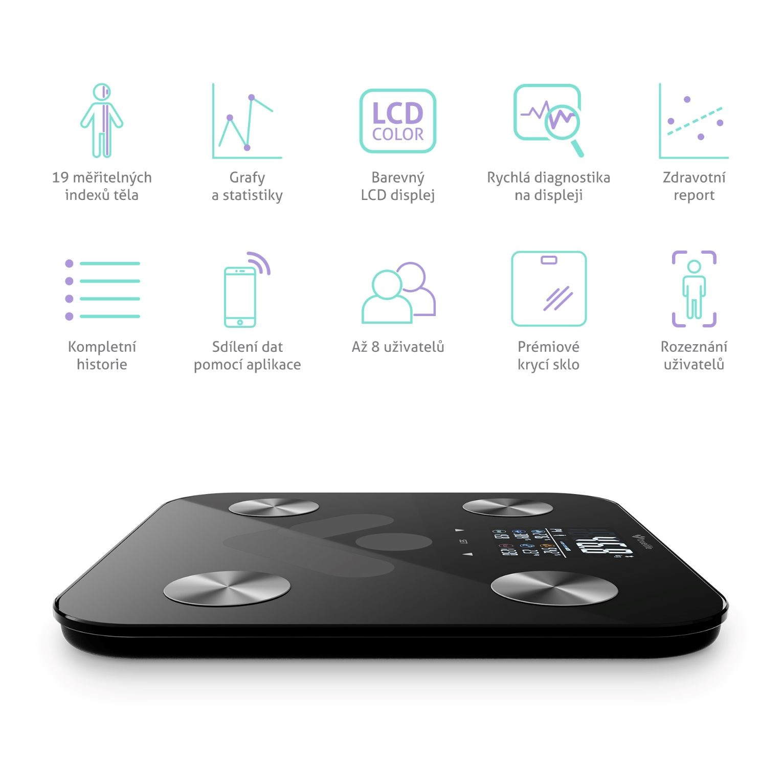 Váha dokáže automaticky rozpoznať až 8 používateľov a zapamätať si ich údaje. Navzájom si tak môžu porovnávať výsledky a sledovať svoje pokroky.