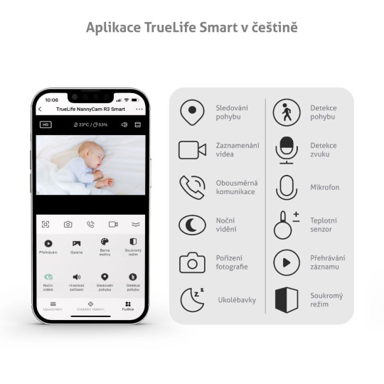 Prostredníctvom aplikácie TrueLife Smart si pestúnku TrueLife NannyCam R3 Smart nastavíte presne podľa potrieb seba aj dieťaťa. Pre váš pokoj zaznamenáva inteligentný detektor zvuk, pohyb i teplotu a v prípade zmien obdržíte upozornenie na svoj telefón. Dieťatku pestúnka poskytuje upokojenie v podobe uspávaniek, a dokonca dokáže napodobniť aj tlkot srdca. Ak reaguje dieťa skôr na váš hlas, môžete s ním komunikovať vďaka obojsmernej komunikácii. Túto funkciu určite oceníte aj u starších detí.