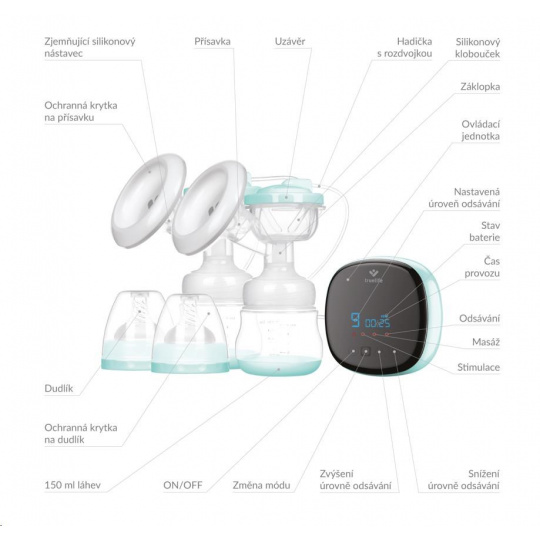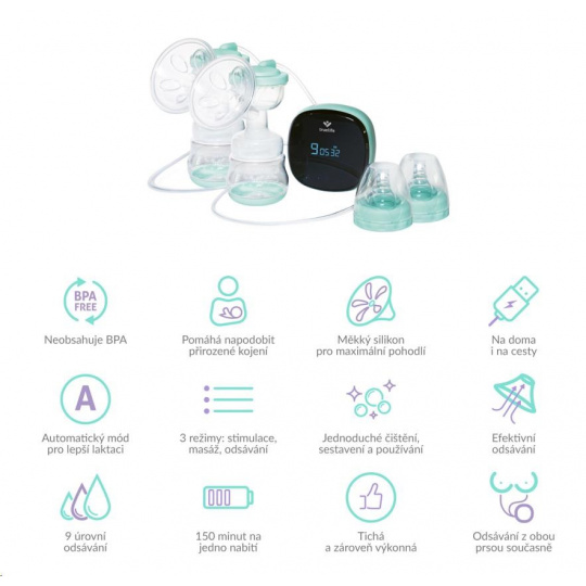 Dvojitá prsná odsávačka Nutrio BP Electric Double, ktorá odoberá mlieko z oboch pŕs súčasne, vám pomôže rýchlejšie vyriešiť nedostatok alebo prebytok materského mlieka než klasická odsávačka. Zároveň je výhodnejšia na pravidelné použitie, či už kvôli zdravotným alebo časovým dôvodom. Pomocou dvojitej odsávačky navyše odsajete v priemere o 18 % viac mlieka, než pri odsávaní z každého pŕs zvlášť. Mlieko, ktoré získate odsávaním z oboch pŕs súčasne, podľa výskumov obsahuje vyšší podiel tuku a kalórií. Nutrio BP Electric Double je vďaka technológii MilkFlowStimulation® vhodná aj pre mamičky, ktoré majú problémy s laktáciou alebo kojením vo všeobecnosti. Pomôže však aj v situáciách, keď sa dieťa nechce samo prisávať k pŕs. Na ovládanie odsávačky a sledovanie priebehu odsávania slúži intuitívny displej s niekoľkými dotykovými tlačidlami a časovačom. U tretieho módu si môžete vybrať z deväť úrovní, aby si ste si nastavili intenzitu odsávania tak, aby vám to bolo pohodlné.