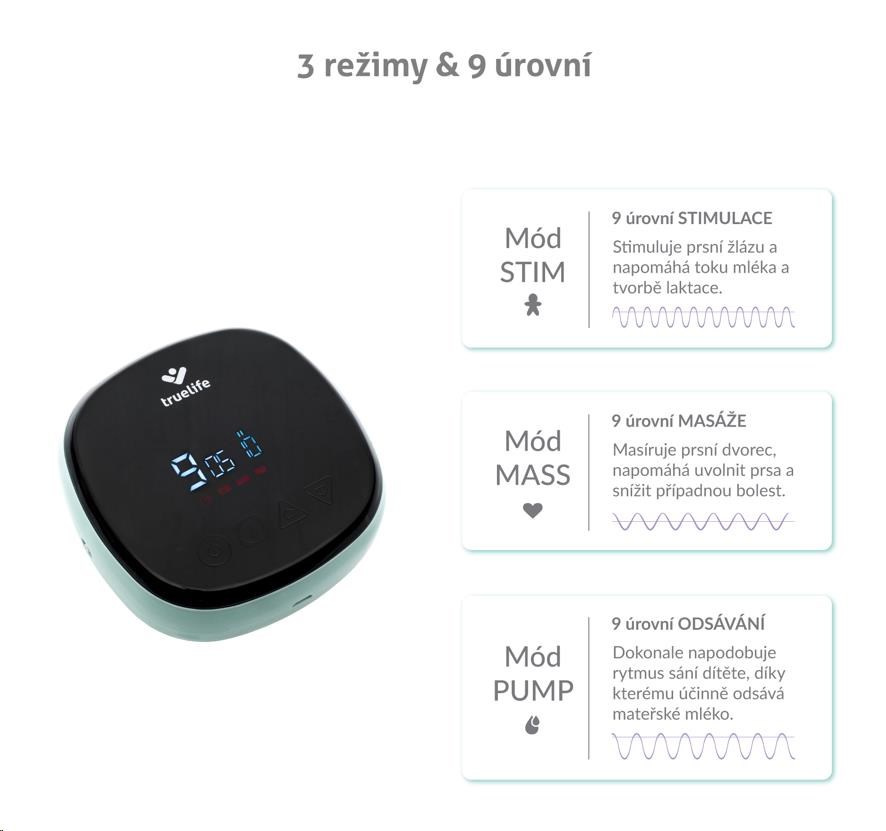 Krome odsávania môžete zvoliť ešte mód stimulácie alebo masáže. U každého módu máte na výber z deväť úrovní, takže si odsávačku nastavíte presne tak, ako vám to vyhovuje.