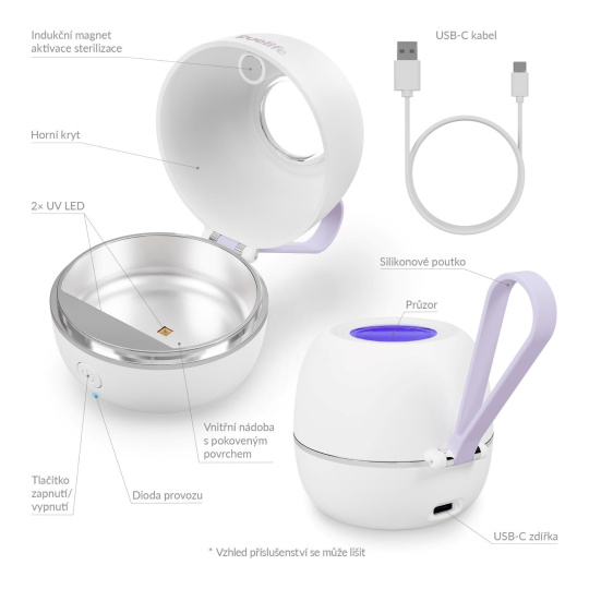 Sterilizátor je vyrobený z odolného plastu bez BPA, takže je úplne bezpečný. O pokoj rodičov sa stará aj bezpečnostný systém veka, ktorý zabezpečí, že sterilizácia sa spustí len vtedy, keď je veko správne zatvorené, a pri otvorení sa okamžite zastaví. Vďaka priehľadnému okienku navyše môžete sledovať proces bez unikania UV-C žiarenia.
