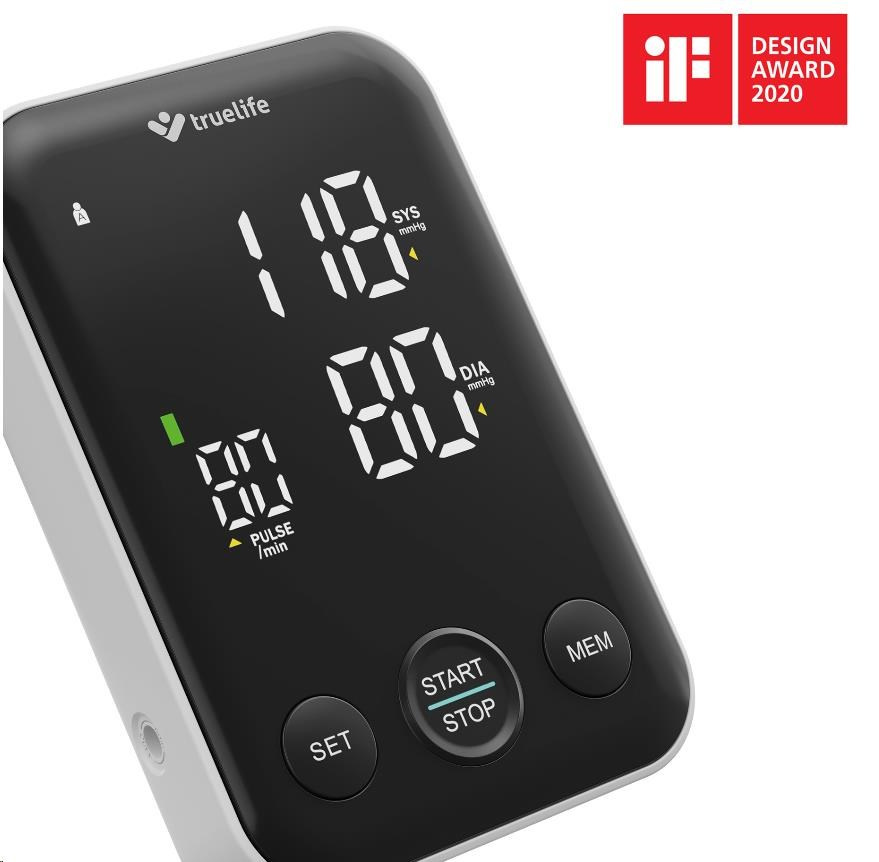 Tlakomer TrueLife Pulse B-Vision je bez pochyby jedinečný svojim dizajnom, o čom svedčí aj prestížne ocenenie Design Award. LED displej, ktorý slúži k zobrazeniu nameraných hodnôt je dostatočne veľký a vďaka čierno-bielemu kontrastnému prevedeniu aj veľmi prehľadný. Súčasťou balenia je praktický stojan, do ktorého jednoducho uložíte tlakomer aj manžetu.
