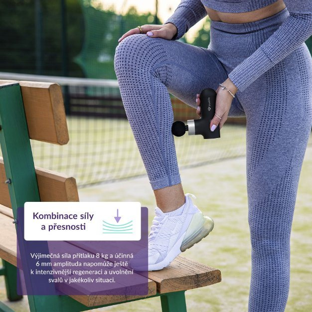 Telo masážnej pištole je síce malé, ľahké a dobre padne do ruky, ale ukrýva v sebe prítlačnú silu až 8 kg. Pracuje však veľmi ticho aj pri frekvencii až 2850 vibrácií za minútu, takže počas masáže nikoho nerušíte. Amplitúda je 6 mm a môžete si vybrať zo 4 intenzít masáže. Časté nabíjanie vás taktiež nemusí trápiť, pretože lítiová batéria vydrží až 3 hodiny používania.