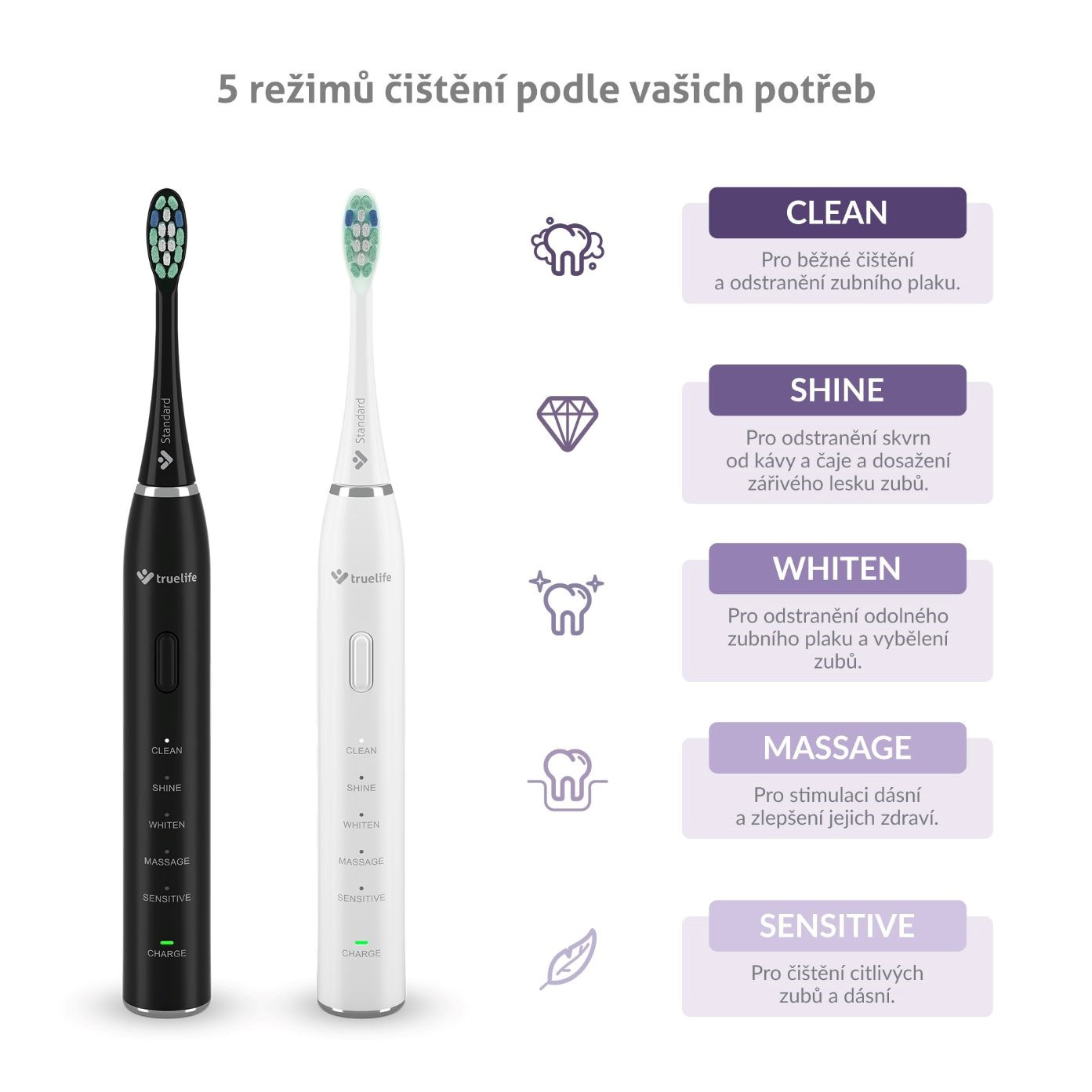 Obe kefky disponujú 5 režimami pre starostlivosť o zuby a ďasná. Clean sa hodí pre štandardné čistenie a odstránenie plaku, Shine zaistí žiarivý úsmev a odstránenie pigmentových škvŕn, Whiten vybieli, Sensitive je určený citlivým zubom a ďasnám, Massage potom ďasná stimuluje a prospieva ich zdraviu.