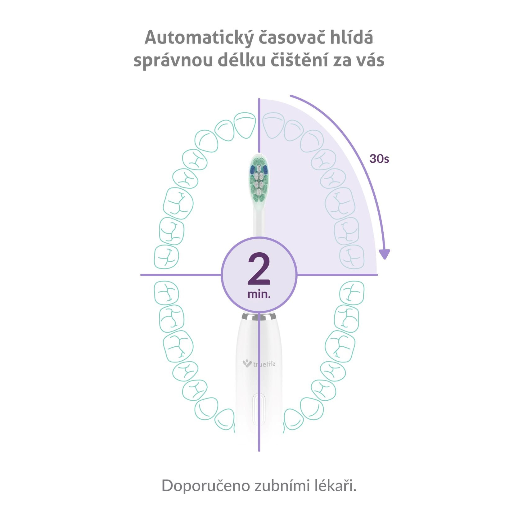 Časovač natavený na 2 minúty je rozdelený do 4 častí po 30 sekundách. Krátke prerušenie vždy upozorní, že je čas začať čistiť ďalšiu časť chrupu.