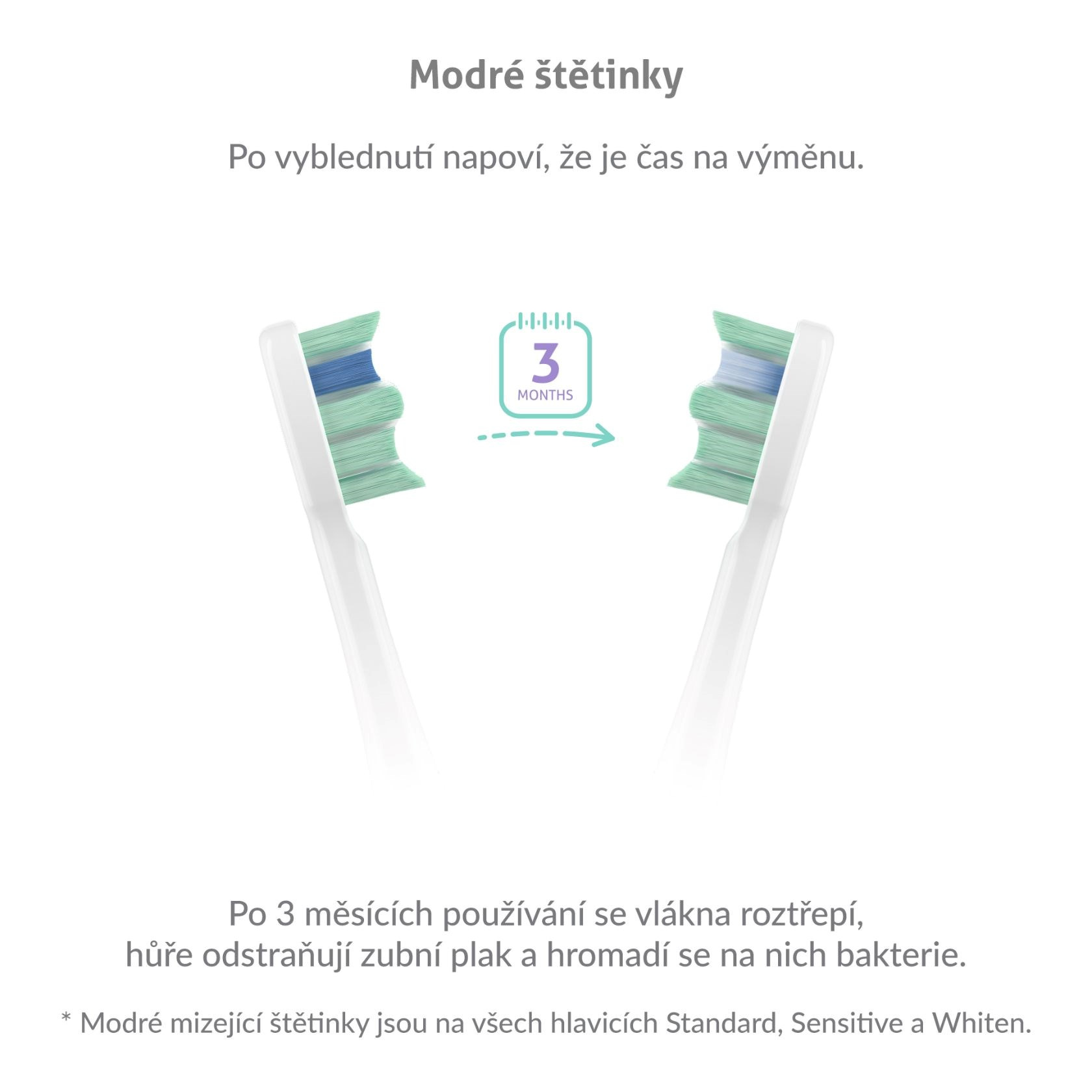 Zhruba po 3 mesiacoch je potrebné vymeniť hlavicu kefky, aby bola zaistená kvalita čistenia. Poznáte to podľa modrých štetiniek, ktoré postupne bielia.