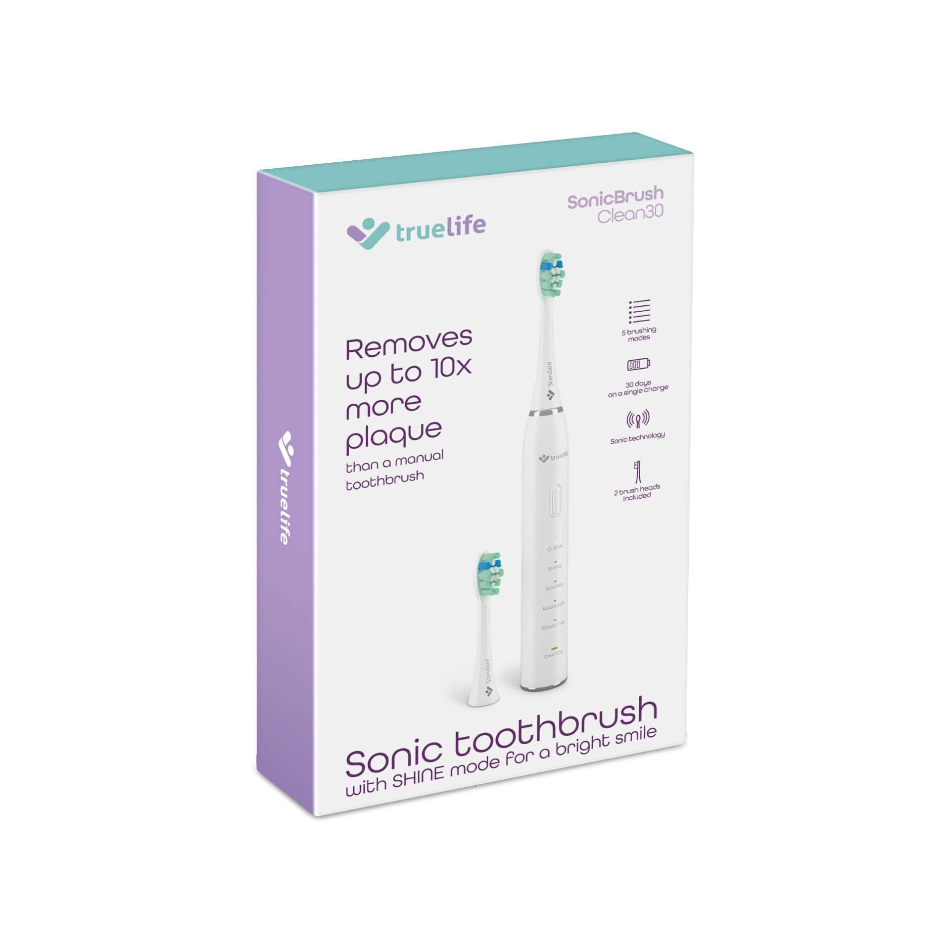 Sonická technológia predstavuje účinný spôsob boja proti zubnému povlaku. Oproti rotačným kefkám je šetrnejšia k zubnej sklovine a vírením vody s pastou pomáha čistiť aj medzizubné priestory. Technológia SonicTrue® funguje na báze jemných vibrácií a oproti manuálnej kefke, s ktorou urobíte približne 600 pohybov za minútu, zvládne TrueLife SonicBrush Clean30 za jednu minútu až 70 000 pohybov pre žiarivý úsmev bez námahy. Hlavica kefky vydrží až 3 mesiace používania, potom sa štetiny začnú strapkať, strácajú účinnosť a navyše sa na nich hromadia baktérie. Našťastie sú hlavice opatrené modrými štetinami, ktoré po 3 mesiacoch vyblednú a vy tak viete, že je načase ich vymeniť.