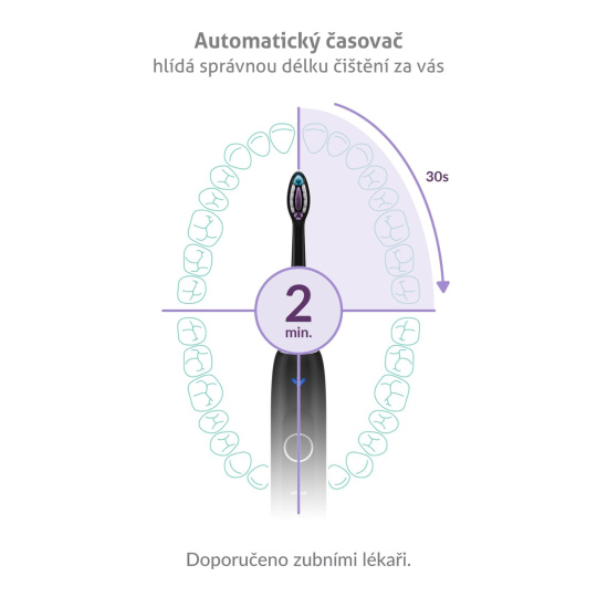 Zuby je ideálne čistiť po dobu 2 minút, čo dohliada automatický časovač. Navyše vždy po 30 sekundách upozorní, že je čas na prechod na ďalšiu časť úst.