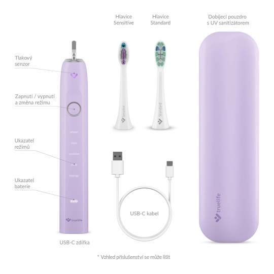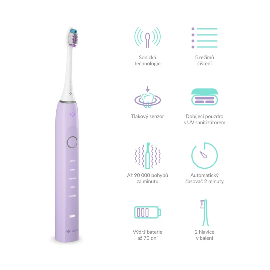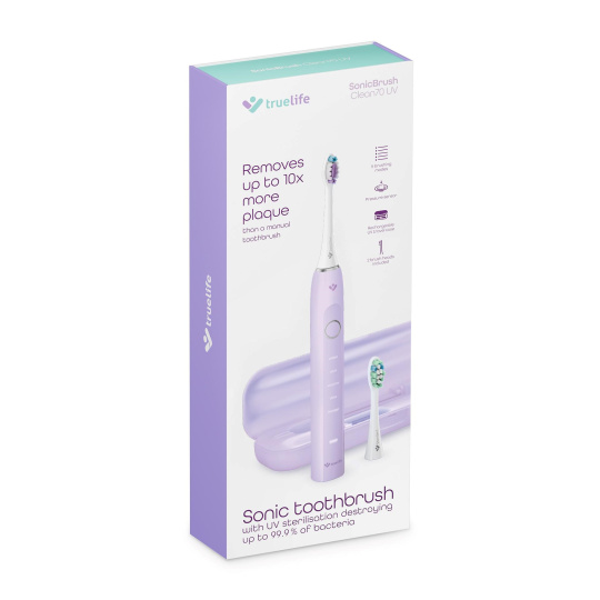 Inteligentné technológie pre to najlepšie dentálne ošetrenie sa stretávajú v TrueLife SonicBrush Clean70 UV, sonickej kefke v elegantnej levanduľovej verzii, ktorá odstráni s výkonom až 90 000 pohybov za minútu až 12× viac zubného plaku ako manuálna kefka. Sonická technológia SonicTrue® pomocou jemných vibrácií čistí plochy zubov a vďaka víreniu vody s pastou vytvára mikrobublinky, ktoré prenikajú do medzizubných priestorov. Tlakový senzor s technológiou SmartPressure® sleduje, aby ste si pri prílišnom tlaku na zuby a ďasná nepredstavovali zdravotné ťažkosti. Veľkú službu vám poskytne aj UV sterilizácia ukrytá v nabíjacom puzdre, ktorá efektívne ničí až 99,9 % baktérií a vírusov z hlavice kefky. O svoje zuby sa môžete starať doma aj na cestách, a to až 70 dní na jedno nabitie, pomocou 5 režimov čistenia (Whiten, Clean, Sensitive, Shine, Massage) a 2 priložených hlavíc (Standard a Sensitive). Posledný použitý režim zostáva uložený v pamäti a automaticky sa spustí pri opätovnom zapnutí. Kefka beží ideálne 2 minúty, na ktoré je nastavený časovač. Vďaka vysoko citlivému vibračnému senzoru sa navyše automaticky aktivuje a rozsvieti, keď ju vezmete do ruky, stačí ju len uchopiť a môžete začať s čistením. Špeciálny jemne pogumovaný povrch rukoväte je príjemný na dotyk a zabraňuje klzaniu aj pri použití s vodou.
