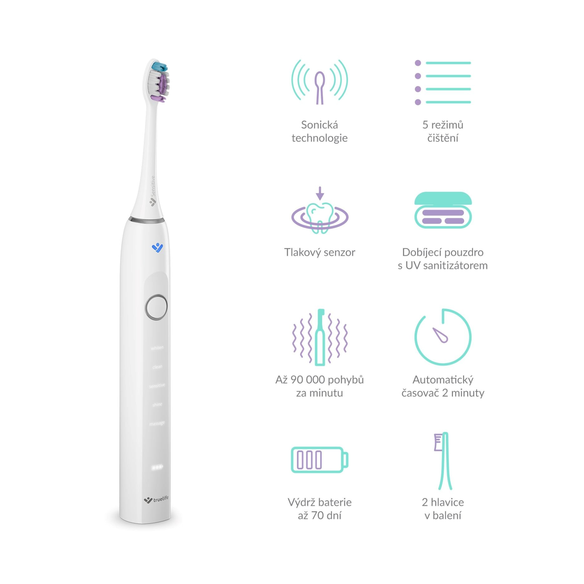 Stačí jediná kefka na riešenie rôznych problémov. Balenie sonicovej kefky TrueLife SonicBrush Clear70 UV obsahuje 2 hlavice. Štandard pre každodenné čistenie a Sensitive s extra jemnými štetinkami pre citlivé zuby. Môžete si dokúpiť aj hlavicu Whiten na bielenie zubov. Hlavice však nie sú jedinými pomocníkmi pri starostlivosti o zuby a ďasná, svoju prácu vykonáva aj 5 režimov čistenia. So štandardným čistením si poradí režim Clean, o citlivé zuby a ďasná sa postará režim Sensitive, pre žiarivý lesk a odstránenie škvŕn od čaju a kávy použite režim Shine, na odstránenie odolného zubného plaku a bielenie zubov je určený režim Whiten, ak chcete zlepšiť zdravie ďasien a stimulovať ich, je ideálny režim Massage.