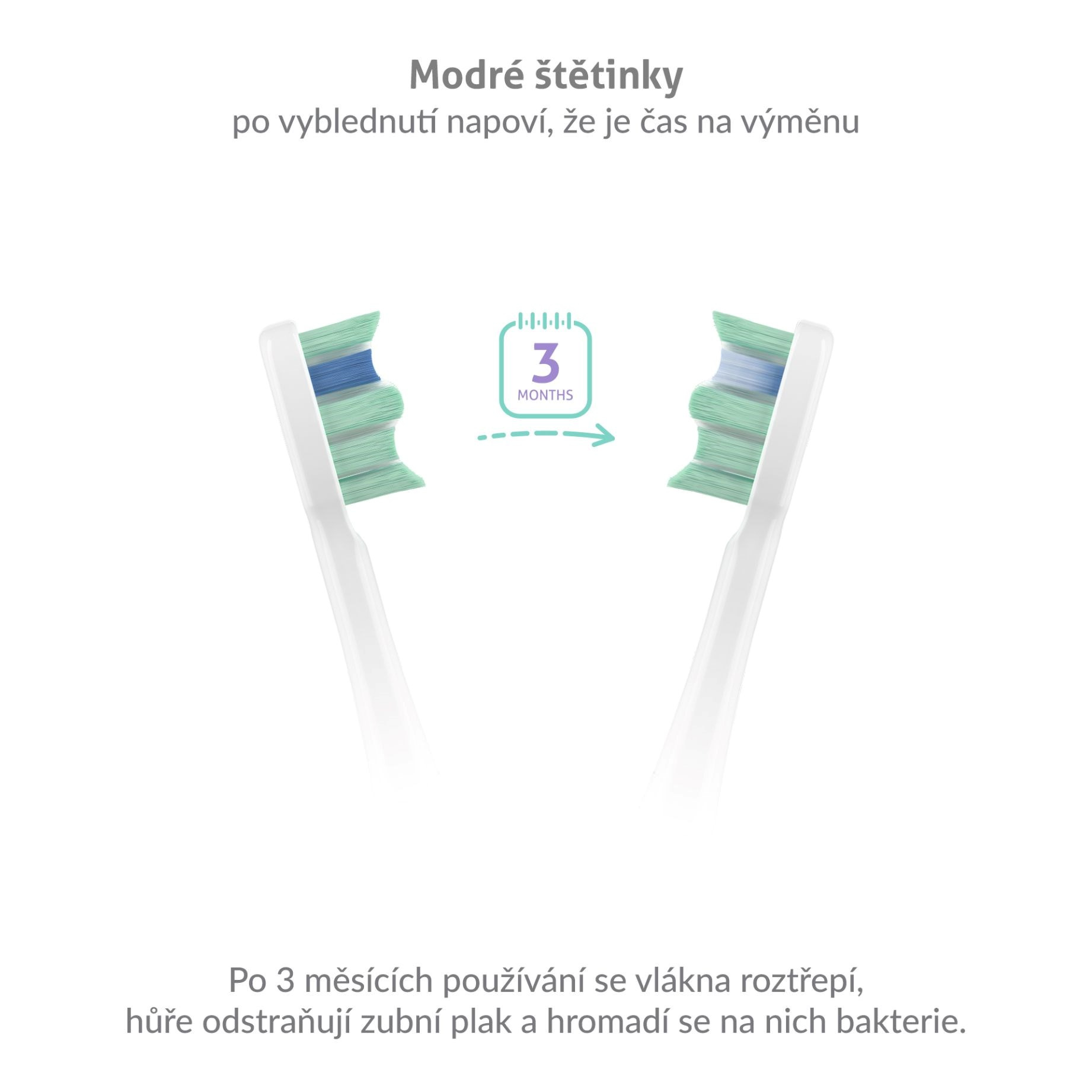Opotrebované štetinky kefky sa rozstrapkávajú, strácajú účinnosť a na nich sa hromadia baktérie. Hlavice sonicovej kefky sú osadené modrými štetinkami, ktoré po 3 mesiacoch zblednú a upozornia vás tak na nutnosť výmeny.