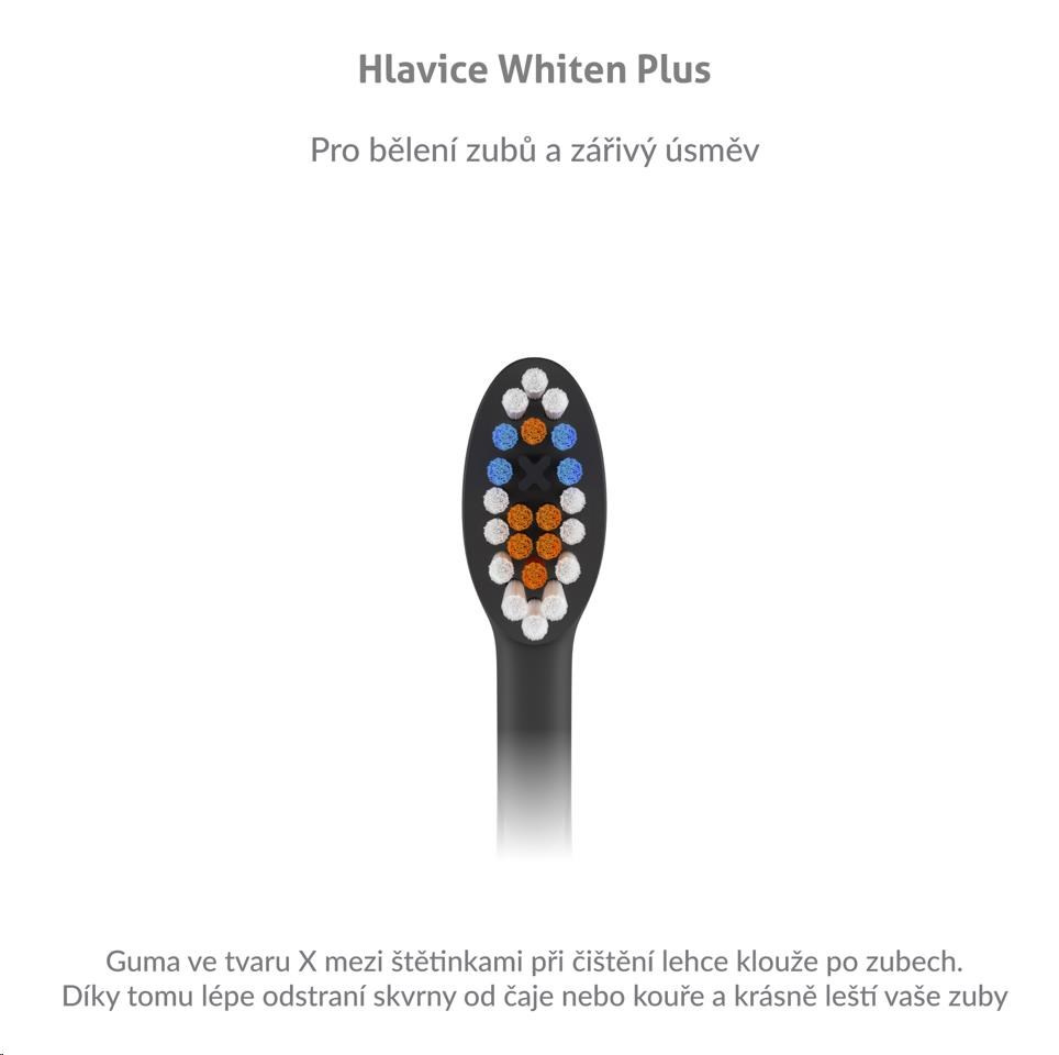 Vymeniteľné hlavice sú špeciálne vyvinuté pre bielenie zubov. Guma vo tvaru X medzi štetinkami pri čistení ľahko klouže po zuboch. Vďaka tomu lepšie odstráni škvrny od čaju alebo cigariet a krásne leští vaše zuby.
