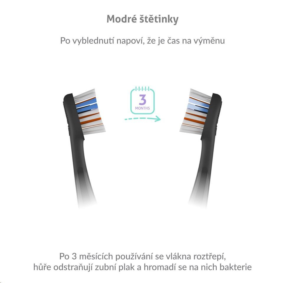 Hlavice vydržia až 3 mesiace používania, potom sa začnú triasať, strácajú účinnosť a navyše sa na nich hromadí baktérie. Našťastie sú hlavice vybavené modrými štetinkami, ktoré po 3 mesiacoch vyblednú a vy tak viete, že je čas hlavicu vymeniť.