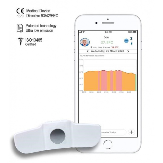 TUCKY – inteligentný teplomer a monitor polohy prináša riešenie tejto situácie. Certifikovaný pre lekárske použitie, jednoducho ho nalepte pod pravú ruku vášho malého pacienta a TUCKY mu každú minútu presne zmeria teplotu a odošle meranie do vášho zariadenia so systémom iOS/Android. Teplotu môžete neustále sledovať, alebo sa môžete spoľahnúť naautomatické upozornenie až vtedy, keď teplota dosiahne určitú hodnotu , a okamžite podať lieky na zabitie horúčky. TUCKY ušetrí vaše dieťa pred nepríjemným utrpením s horúčkou a dodá vám väčší pokoj.