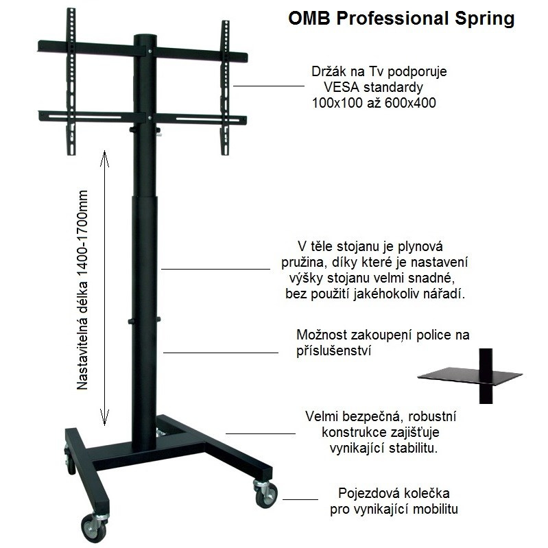 Tv stojan OMB Professional Spring Televízny stojan s plynovou pružinou pre jednoduché a rýchle nastavenie výšky 140-170cm bez náradia, nosnosť 40kg, VESA 100x100 až 600x400, na televízory a monitory 32" až 65" Profesionálny stojan robustnej, veľmi pevnej, bezpečnej a stabilnej konštrukcie, ktorý má vo vnútri nosníka integrovanú plynovú pružinu pre možnosť veľmi jednoduchého nastavenia výšky obrazovky bez nutnosti použitia akéhokoľvek náradia, navyše neuveriteľne rýchlo a pohodlne. Plynová pružina zabezpečí po stlačení bezpečnostnej páčky plynulé vysunutie obrazovky do hornej polohy, v prípade potreby znížiť výšku stačí zatlačiť na obrazovku. Regulovať výšku je možné v rozmedzí 140cm až 170cm (výška stojana po stred obrazovky). Stojan je ideálny na televízory a monitory s hmotnosťou do 40kg, ktoré podporujú akýkoľvek VESA štandard v rozmedzí 100x100 až 600x400mm vrátane. Odporúčaná uhlopriečka je 32" až 65", avšak je možné použiť aj väčšie obrazovky až do uhlopriečky 65". Podstavec stojana je osadený kvalitnými pojezdovými kolieskami, ktoré zabezpečujú vynikajúcu mobilitu. Televízny stojan OMB Professional Spring dodávame v čiernom prevedení. Televízny stojan s nastavením výšky a kolieskami OMB Professional Spring Technické údaje: max. zaťaženie 40kg podpora VESA štandardu 100x100 až 600x400 odporúčaná uhlopriečka zavešené obrazovky 32" až 65" nastaviteľná výška stojana v rozmedzí 1400 až 1700mm integrovaná plynová pružina pre jednoduché a rýchle nastavenie výšky bez použitia náradia možnosť dokúpenia police na príslušenstvo OMB Shelf Handy s rozmermi 447x300mm nosnosť police na príslušenstvo 5kg robustná, veľmi pevná konštrukcia profesionálna kvalita bezpečný, stabilný stojan farebné prevedenie čierne záruka 3 roky Televízny stojan s plynovou pružinou pre jednoduché a rýchle nastavenie výšky v rozmedzí 140 až 170cm, nosnosť 40kg, VESA štandard 100x100 až 600x400 - OMB Professional Spring Televízny stojan OMB Professional Spring podporuje VESA štandardy: VESA 100x100 VESA 200x100 VESA 200x200 VESA 300x200 VESA 300x300 VESA 400x200 VESA 400x300 VESA 400x400 VESA 600x400 Na TV stojan je možné zavitieť všetky typy televízorov a monitorov, ktoré majú hmotnosť do 40kg a podporujú ktorýkoľvek z vyššie uvedených VESA štandardov. Veľkosť televízora nie je podstatná, len odporúčame minimálnu uhlopriečku 32", ideálne 37" a väčšie. Na televízny stojan OMB Professional Spring je možné dokúpiť police na príslušenstvo OMB Shelf Handy s nosnosťou 5kg: Police na príslušenstvo ku stojanu OMB Professional Spring - OMB Shelf Spring Vďaka výbornému riešeniu nastaviteľnej výšky pomocou plynové pružiny zvládne nastavovanie výšky bez akéhokoľvek náradia a námahy ktokoľvek. Stojan je ideálny na využitie pri prezentáciách, výstavách, prednáškach, konferenciách, čakárňach a kdekoľvek pre komerčné aj nekomerčné účely.
