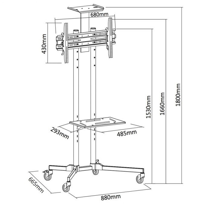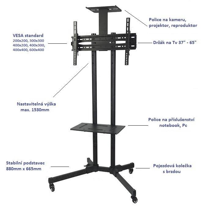 Tv stojan s policami Fiber Mounts M6C61 Stojan na televíziu 37-65", nastaviteľná výška max. 153cm, policˇka na príslušenstvo a na kameru, kolieska s brzdou, VESA 200x100 až 600x400, nosnosť 50kg Kvalitný podlahový stojan na TV 37-65" s pojazdnými kolieskami s aretáciou a policˇkami na príslušenstvo a na kameru. Stojan umožňuje nastaviť výšku televízie a výšku policˇiek. Systém pre vedenie káblov. Podpora VESA štandardov 200x100 až 600x400, nosnosť 50kg. Farebné prevedenie čierne, záruka 3 roky. Televízny stojan s policˇkami na príslušenstvo a na kameru Fiber Mounts M6C61 Technické údaje: nosnosť 50kg podporuje VESA štandardy 200x100 až 600x400 na televízie a monitory s uhlopriečkou 37" až 65" nastavenie výšky televízie, max. 153cm policˇka na príslušenstvo 485x293mm s nastavením výšky, nosnosť 5kg policˇka na kameru, nosnosť 3,5kg pojazdové kolieska s brzdou systém pre vedenie káblov kvalitná konštrukcia farebné prevedenie čierne záruka 3 roky Tv stojan s policˇkami a kolieskami Fiber Mounts M6C61 Televízny stojan Fiber Mounts M6C61 podporuje VESA štandardy: VESA 200x100 VESA 200x200 VESA 300x200 a 200x300 VESA 300x300 VESA 400x200 a 200x400 VESA 400x300 a 300x400 VESA 400x400 VESA 600x400