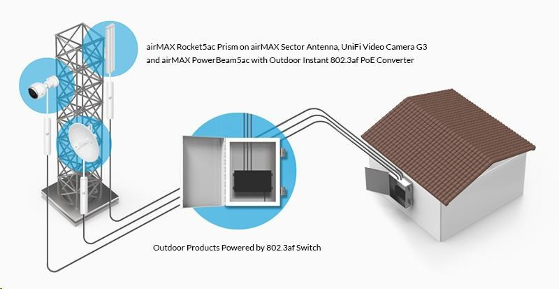 tento gigabitový konvertor možno použiť na napájanie prepínačov UBNT s aktívnym PoE podľa normy 802.3af (48 V). Prevodník komunikuje so spínačom podľa 802.3af a výstup je už klasický pasívny PoE, v tomto prípade 24V/0,5A. Môže sa používať so všetkými jednotkami Ubiquity (je kompatibilný aj s routerboardmi Mikrotik).