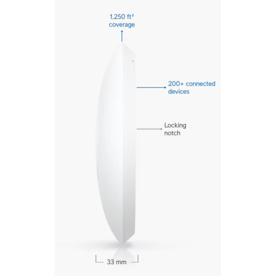 Popis produktu Ubiquiti U7-Lite je cenově nejdostupnější WiFi 7 UniFi AP. Jedná se o dual-band access point s rychlostí přenosu až 4,3Gbps v 5GHz pásmu a až 688 Mbps v pásmu 2,4GHz a pokročilým šifrováním WPA3. U7-Lite je určeno k WiFi pokrytí vaší domácnosti, kanceláře, hotelových prostor nebo skladu. Plná podpora roamingu zajišťuje plynulé předávání připojených klientů mezi jednotlivými AP. Pro připojení do sítě je AP vybaveno 2.5G ETH portem, který slouží i pro napájení pomocí PoE 802.3af nebo pasivním PoE v rozsahu 42,5-57V DC, PoE injektor není součástí balení. Výhody UniFi řešení • Roaming - přechod mezi jednotlivými AP bez výpadků • Wireless uplink – ideální pro místa, kam nelze přivést datový kabel • Až 8 SSID • Detailní statistiky provozu • Guest síť • Load balancing - udržování rovnoměné zátěže / přepínání klientů • Omezování rychlosti pro každé SSID Obsah balení • Zařízení • Kit k přichycení na strop • Sada šroubků Technické parametry Bezdrátové vlastnosti Bezdrátové frekvence:2.4 + 5 GHz (dual band) WiFi standardy:802.11n, 802.11a, 802.11ac, 802.11b/g, 802.11ax, 802.11be MU-MIMO:Ano Přenosová rychlost - 5GHz [Mb/s]:4300 Přenosová rychlost - 2.4GHz [Mb/s]:688 Vysílací výkon 2.4GHz [dBm]:23 Vysílací výkon 5GHz [dBm]:24 Šifrování:WPA, WPA2, WPA3 2.4GHz MIMO:2 x 2 5GHz MIMO:2 x 2 Typ antény:Vestavěná Roaming:Ano Zisk antény [dBi]:4, 5 Konektory a rozhraní Rychlost LAN:(1) 100/1000/2500Mbps Gigabit LAN:Ano Napájení Napájení přes PoE:802.3af, 42 .. 57V DC Typy PoE:PoE-In (pouze) Max. spotřeba energie [W]:13 Fyzické charakteristiky Použití:Vnitřní Tlačítka:Reset Provozní teplota [°C]:-30 až 40 Hmotnost [g]:313 Šířka [mm]:172 Výška [mm]:172 Hloubka [mm]:33 Software Operační mód:Access Point.