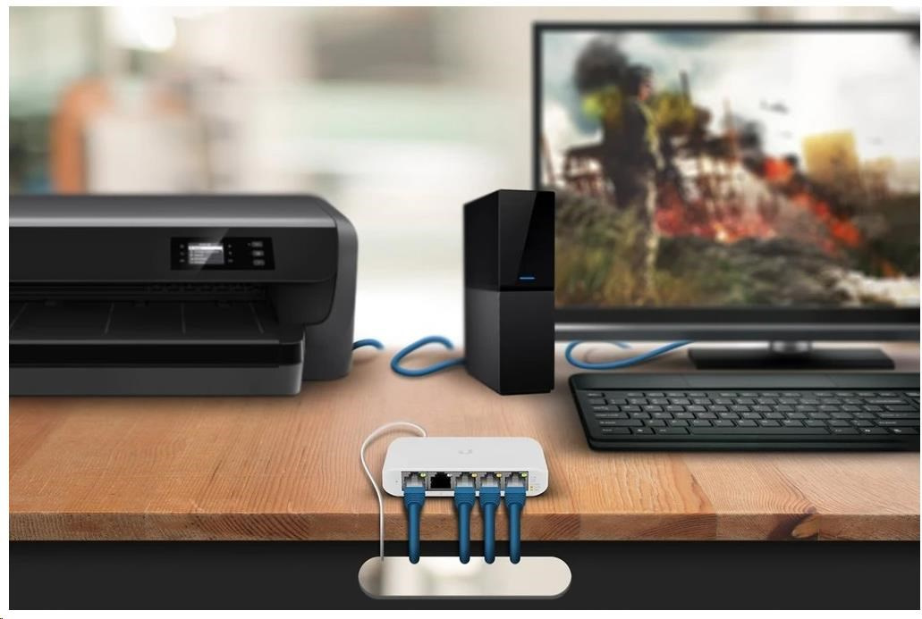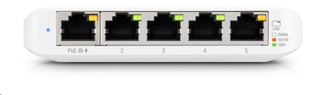 USW-Flex-Mini je malý 5-portový gigabitový prepínač so správou UniFi Controller od spoločnosti Ubiquiti Networks v stolnom vyhotovení s prvým portom podporujúcim PoE In.