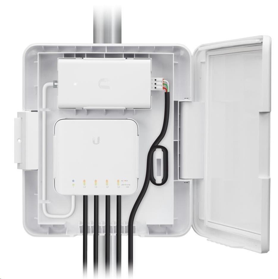 uSW-Flex-Utility je vonkajší box odolný voči poveternostným vplyvom, ktorý je špeciálne navrhnutý na použitie so zariadením UniFi Switch Flex (USW-Flex). USW-Flex-Utility sa dá ľahko namontovať na akýkoľvek stĺp, čo umožňuje úplne jednoduché vedenie káblov a zabezpečenie pomocou skrutiek.