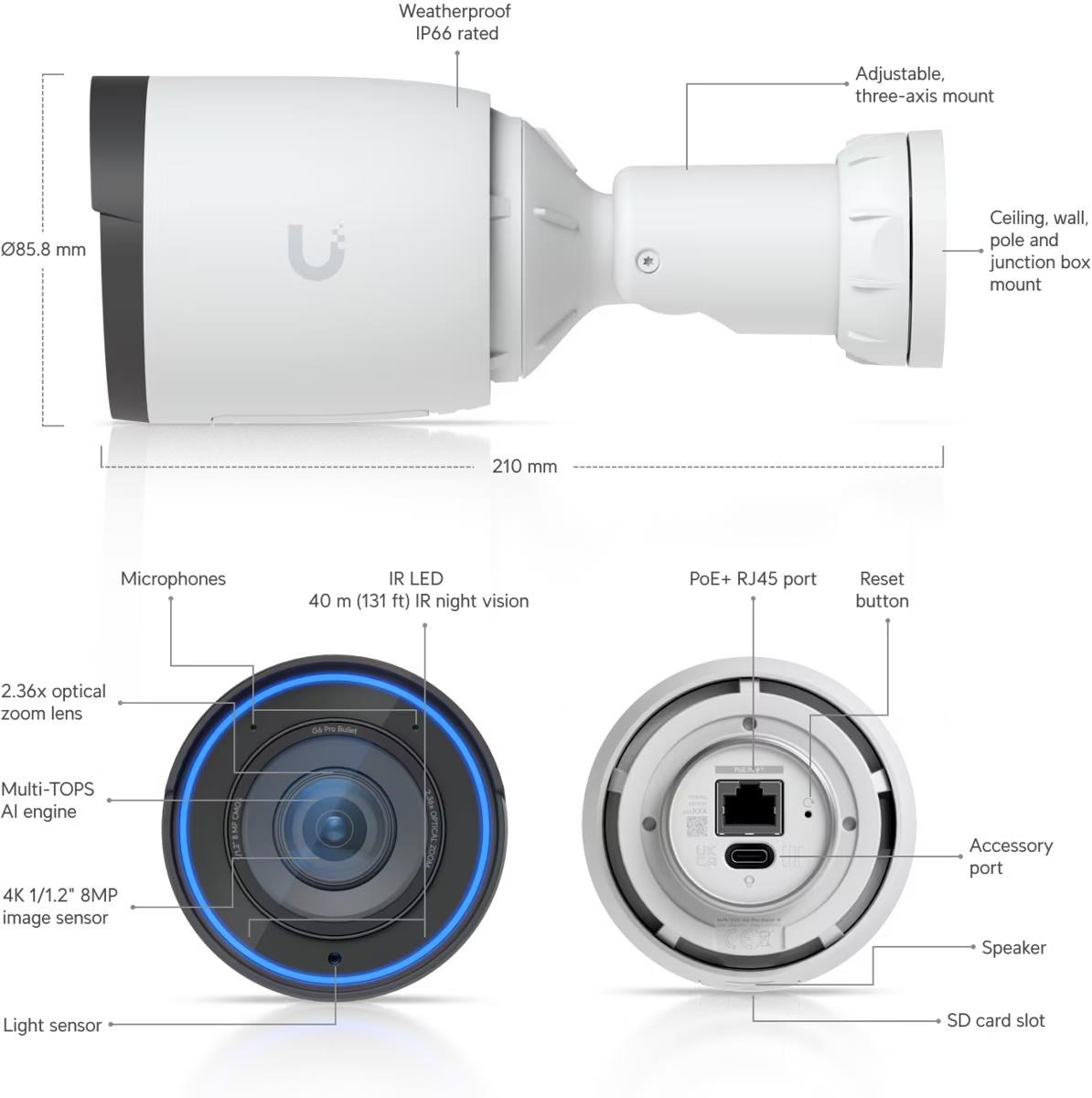Popis produktu Ubiquiti G6 Pro Bullet disponuje 8MP snímačem (3840 x 2160px) při 30 fps, variofokálním objektivem (2,36x optický zoom), adaptivním IR přísvitem pro noční vidění na vzdálenost až 40m. Kamera má odolné šasi z hliníku a polykarbonátu, krytí IP66 proti prachu a tryskající vodě. Do sítě lze kameru připojit pomocí Gigabit LAN s podporou napájení přes PoE (37 až 57V DC) s maximální spotřebou 15W. Klíčové vlastnosti 4K (8MP), 30 FPS video (3840 x 2160px) Pokročilá AI detekce nejrůznějších objektů a událostí Noční režim s IR LED diodami, IR cut filtr IP66 kryt odolný proti povětrnostním vlivům IK04 odolnost vůči vandalům Napájení pomocí PoE (37 až 57V DC) Spravováno softwarem UniFi Protect Vestavěné mikrofony a reproduktor Provedení v bílé barvě Obsah balení Zařízení Šroubky, hmoždinky Držáky na zeď/strop a stožár Technické parametry Kamera Zoom (optický):31x Typ objektivu:Varifokální - motorický Objektiv [mm]:5,9 až 13,8 (nastavitelný) Přísvit:IR Dosah přísvitu [m]:40 Pozorovací úhel [°]:45,5 až 113,8 Režim den/noc:IR cut filtr Obrazový senzor ["]:1/1.2 Obraz Rozlišení:8MP Max. rozlišení [pixely]:3840 x 2160 (4K UHD) Konektory a rozhraní Slot na paměťové karty:microSD Audio:2 Mikrofony, Reproduktor Rychlost LAN:(1) 1000Mbps Napájení Napájení přes PoE:802.3at, 37 .. 57V DC Typ napájení:PoE Max. spotřeba energie [W]:15 Fyzické charakteristiky Stupeň krytí:IP66 Použití:Venkovní Antivandal (ochrana proti nárazu):IK4 Tlačítka:Reset Provozní teplota [°C]:-20 až 50 Hmotnost [g]:752 Šířka [mm]:86 Výška [mm]:86 Hloubka [mm]:106 Barva:Bílá Hardware CPU:Quad-Core ARM Cortex-A53 Obecné Kamerová řada:UniFi Protect.