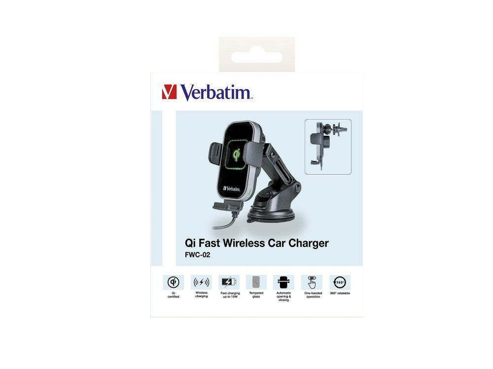 VERBATIM Držák do Auta Bezdrátová rychlonabíječka Qi 15W FWC-02