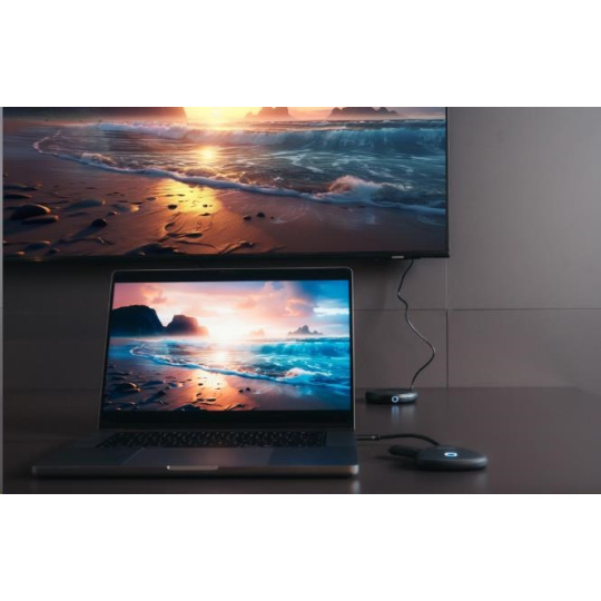 Jednoduché párovanie zaisťuje rýchle a bezpečné pripojenie, ktoré uspokojí všetky úrovne technickej zdatnosti. Pripája chytré telefóny, tablety a notebooky k monitorom, televízorom a projektorom a je univerzálne kompatibilný so zariadeniami USB-C. Rozšírte svoj dosah a pohybujte sa až do 10 metrov bez straty signálu.