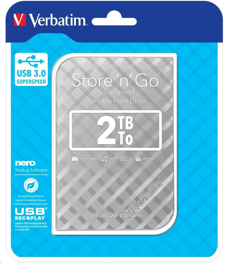VERBATIM HDD 2.5" 2TB prenosný pevný disk Store 'n' Go USB 3.0, strieborná Špeciálne funkcie: Dostupné farby: čierna, strieborná, biela, červená a modrá Dostupné kapacity: 500 GB, 1 TB a 2 TB Vysokorýchlostné úložisko s vysokou kapacitou. Rýchle a bezpečné riešenie na rozšírenie úložiska alebo zálohovanie súborov USB 3.0 SuperSpeed - pre veľmi rýchly prenos dát Nero Backup Software Softvér na úsporu energie USB REC & PLAY* - podporuje nahrávanie/prehrávanie cez USB 2 roky obmedzená záruka** Systémové požiadavky: PC alebo Mac s USB 3.0 Windows XP / Vista / Windows 7 a 8 Mac OS X 10.4 alebo vyššia Obsah balenia: Prenosný pevný disk / USB 3.0 Kábel / Nero Backup Software / Green Button Energy Saving Software / Verbatim Formatter / Quick Start Guide / User Guide (predinštalovaný na disku)..