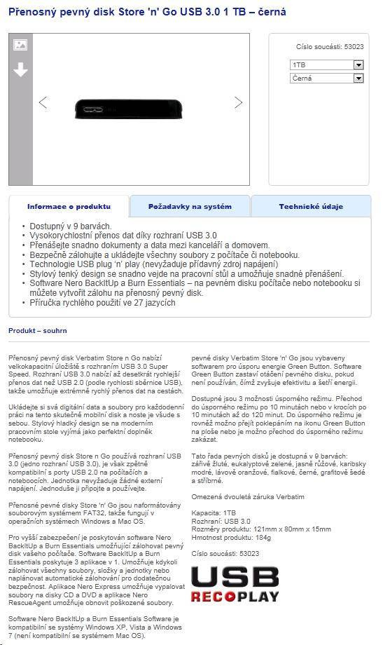 Špeciálne vlastnosti: -Dostupné farby: čierna, -Ultra rýchle USB 3.0 2.5" (6.35 cm) externý pevný disk, kompatibilný smerom nadol s USB 2.0 -USB 3.0 teoretická maximálna rýchlosť prenosu dát: 5 Gb/s -> až 10x rýchlejší ako USB 2.0 -FAT-32 predformátovaný, okamžite pripravený na použitie v PC aj Mac -Vrátane rozsiahleho softvérového balíka: zálohovací softvér na jednoduché zálohovanie súborov z počítača na externý pevný disk, softvér na úsporu energie Green Button, ktorý kontroluje spotrebu energie vášho disku, formátovací softvér na jednoduché (pre)formátovanie externého pevného disku -2 roky záruka výrobcu Hmotnosť produktu: 150 gramov Rozmery produktu: 80 mm x 116 mm x 13 mm (š x d x v) Hmotnosť balenia: približne 200 gramov Rozmery balenia: 145 x 40 x 175 mm (š x v x h)..