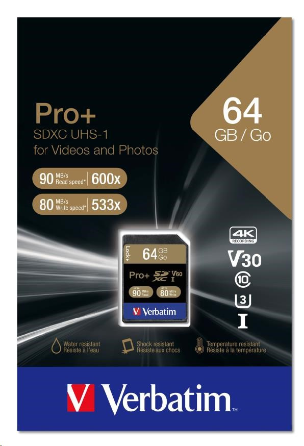 Karta VERBATIM SDXC 64GB PRO+ Class 10, UHS-1 (R:90/W:80 MB/s)